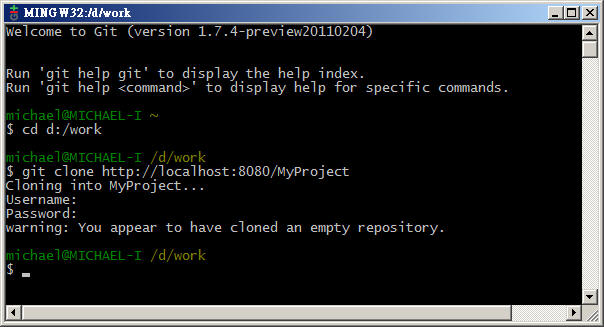 $ git clone http://michael@localhost:8080/MyProject